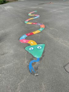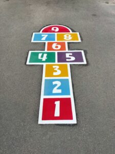 Bunte Hüpfspiele und große Ballons für die Aufstellplätze der ersten Klassen verzieren nun den oberen Schulhof.